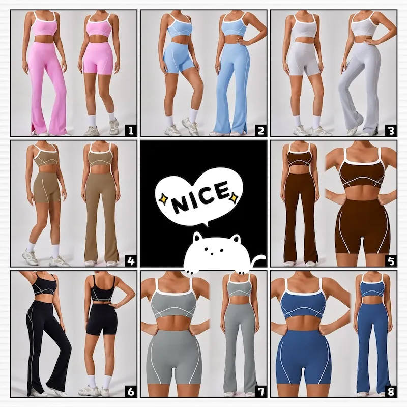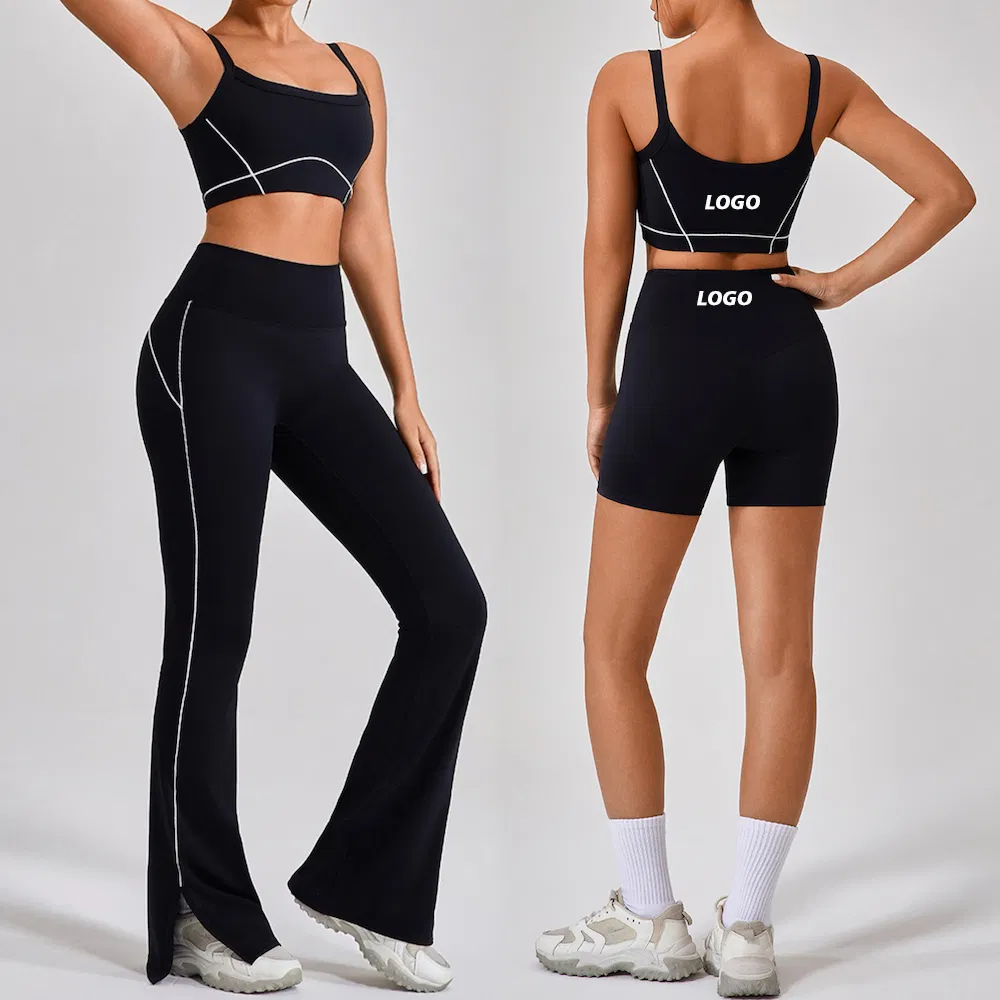Premium activewear designed for women, featuring a private label sports bra, gym shorts, and flared yoga pants. This 3-piece matching patchwork yoga outfit provides a push-up effect and high-waist support for various fitness activities.